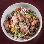Balsamic steak rested on a bed of lettuce tossed in vinaigrette, tomatoes, onion & feta